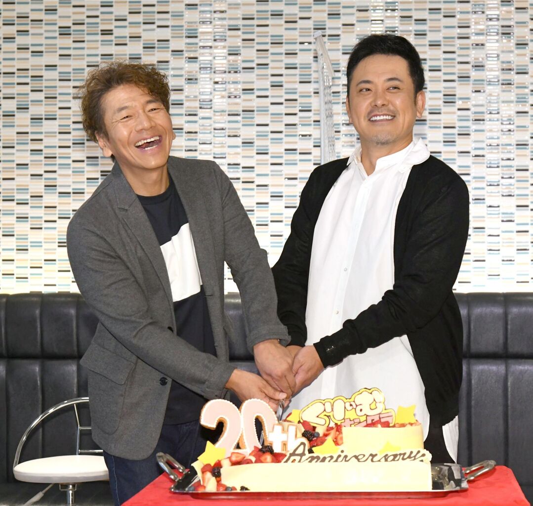 “前身”の「海砂利水魚」からコンビ名を「くりぃむしちゅー」に改名し20年。有田哲平(50)の大好物ということが命名のきっかけだが、「実は今はそんなにクリームシチュー好きじゃないかも。今はうどんと餃子」と告白すると、上田は「もう改名だよ!」と即座にツッコミ。局からメモリアルを祝うケーキが差し入れされ、2人で仲良く?入刀していた。