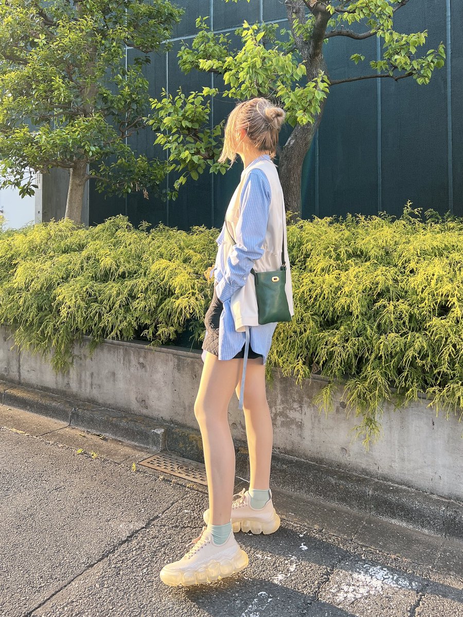 身長171センチのハラミちゃんはインスタグラムに「最近さんぽにハマっとるねん」とコメント。トップスをシャツとジレでまとめ、黒いショートパンツから美脚を披露した。