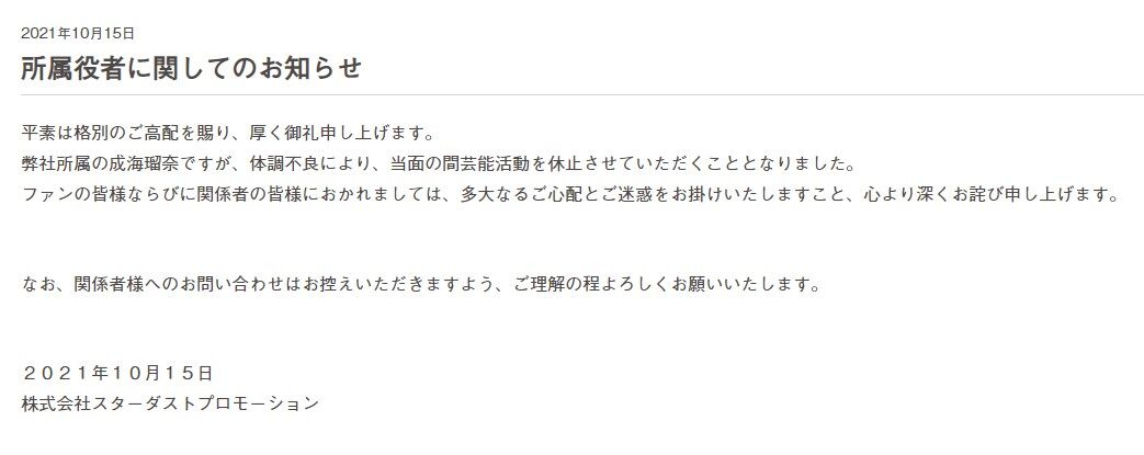 それから数日、今後は2021年10月15日付で所属事務所であるスターダストのウェブサイトに「平素は格別のご高配を賜り、